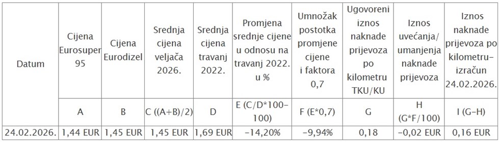Visina naknade troškova prijevoza po prijeđenom kilometru - 24. veljače 2026.