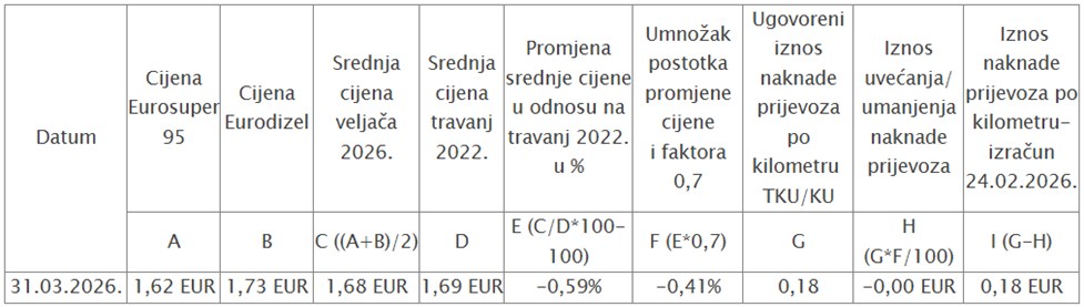 Slijedom navedenog, ugovorena visina naknade troškova prijevoza po kilometru se ne usklađuje, odnosno od 1. travnja 2026. godine iznosi 0,18 eura.