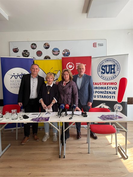 ZAGREB, 3. ožujka 2026. - Tri sindikalne središnjice: Savez samostalnih sindikata Hrvatske (SSSH), Nezavisni hrvatski sindikati (NHS) i Matica hrvatskih sindikata (MHS), te Sindikat umirovljenika Hrvatske (SUH) održali su konferenciju za novinare kojom pozivaju radnike, umirovljenike, studente, kao i sve ostale građane Hrvatske da se priključe prosvjedu „Hrvatska zajedno za veće plaće i mirovine“ koji će se, u njihovoj organizaciji, održati u Zagrebu, na Trgu bana Josipa Jelačića, 18. travnja 2026. godine u 12.00 sati.