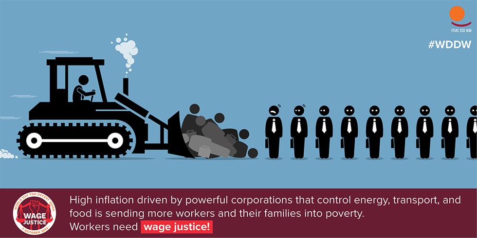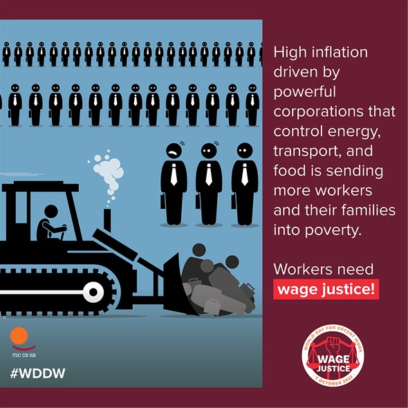 Ovogodišnji Svjetski dan dostojanstvenog rada, 7. listopada, posvećen je milijunima radnika diljem svijeta koji traže pravedne plaće. Neobuzdana inflacija, potaknuta izvlačenjem profita od strane moćnih korporacija koje kontroliraju energiju, prijevoz, hranu i druge ključne robe, šalje još više radnika i njihovih obitelji u siromaštvo.